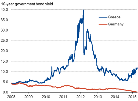 Varufakis spomínal čosi a finančnom terorizme páchanom na Grécku. Má pravdu. V časoch, keď sa hovorilo o trvalom eurovale, hovorilo sa aj o tom, že by gréci mali privatizovať prístavy, ostrovy atď. Neskôr sa začalo hovoriť aj o trvalom eurovale. No tak tí, ktorí si na tom chceli zarobiť pocítili príležitosť. Však to euroval, a všetko to čo je v Egejskom mori zatiahne. Tu posielam graf ako rástli úroky gréckych dlhopisov. Rástli zvlásť v tom období, keď sa rozhodovalo, či vytvoriť trvaly euroval, alebo nie: