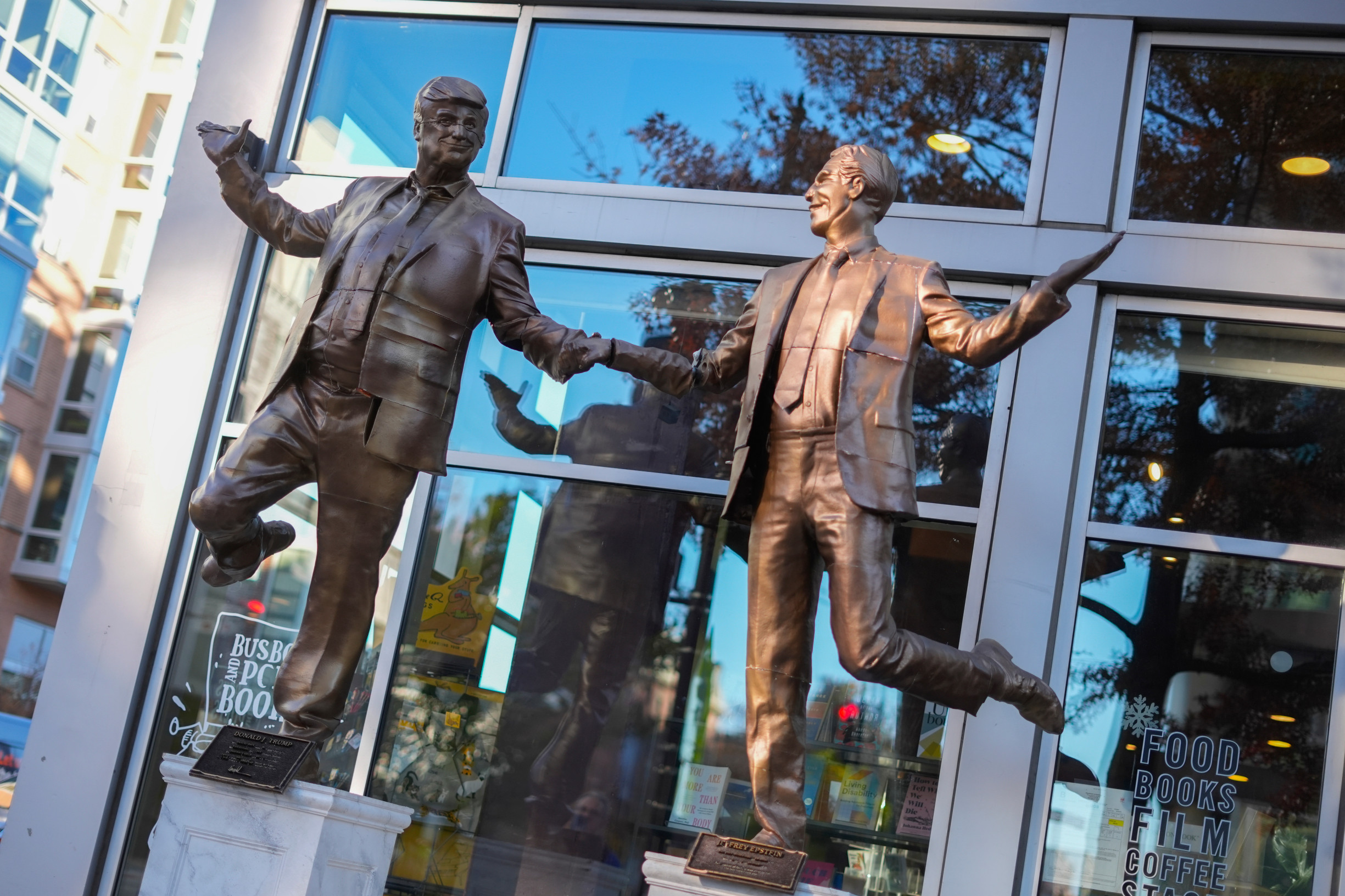 Sochy zobrazujúce prezidenta Donalda Trumpa a Jeffreyho Epsteina pred vchodom do reštaurácie Bustboys and Poets v štvrti U Street vo Washingtone. Foto – TASR/AP